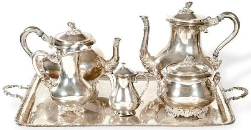 Varias piezas para café y te en plata y metal plateado formando un juego.