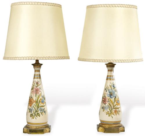 Lote 533: Pareja de lámparas con pie de cerámica pintada sobre base de bronce. Siglo XX.