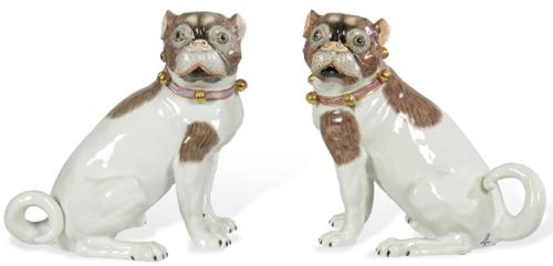 Lote 534: Pareja de fuguras de perro bulldog en porcelana con marca de Dresden en la base.