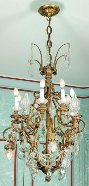 Lote 535: Lámpara de techo con estructura de latón y pandelocas de vidrio.