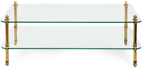 Mesa de centro con tapa y balda de cristal sibre patas de latón. Siglo XX.