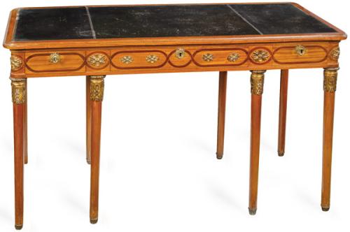 Lote 566: Mesa escritorio estilo Luis XVI con tapa de cuero negro y monturas de latón. Siglo XX.