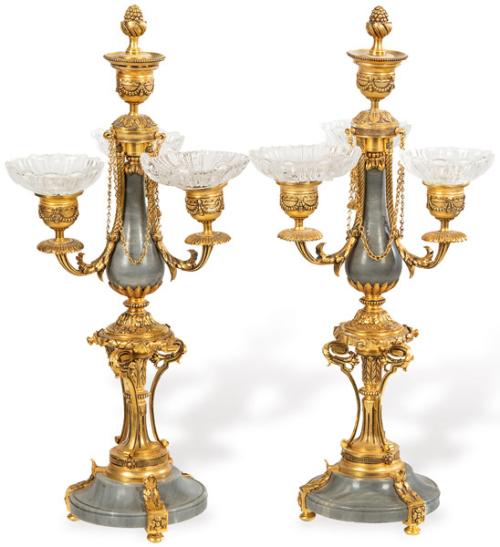 Lote 568: Pareja de candelabros de estilo Luís XVI de bronce dorado, piedra gris, Francia S. XIX