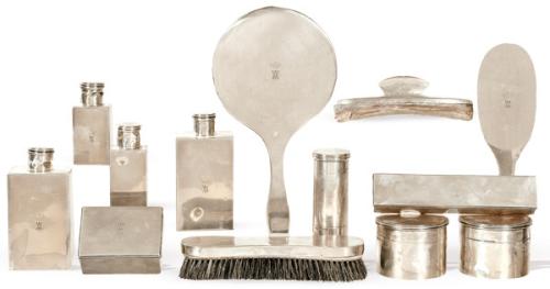 Formado por trece piezas con inicales "VA" coronadas: cinco frascos prismáticos, cepillo largo, cepillo de mango, espejo, cinco cajas (tres cilíndricas y dos rectangulares) y pulidor