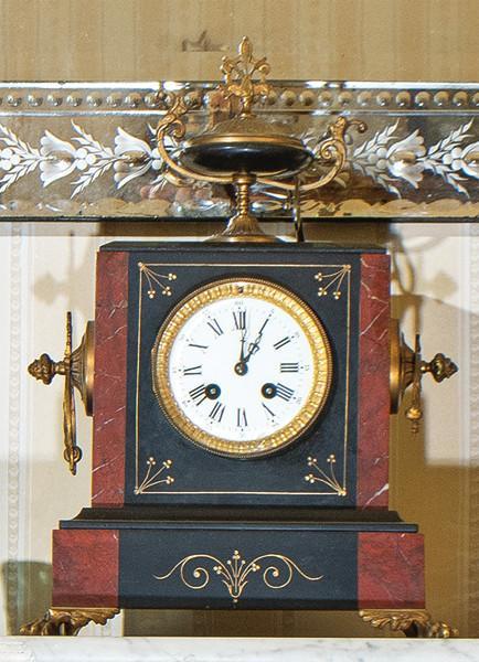 Lote 82: Reloj de chimenea con guarnición de candelabros Napoleón III en mármol negro y rojo con montura de latón. Maquinaria tipo París con sonerías de horas y medias. (Falta campana). Francia, finales del siglo XIX.