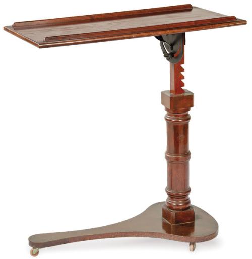 Lote 91: Mesa-atril, regulado en altura y reclinable victoriana en madera de caoba sobre pedestal torneado y plataforma de lados cóncavos. Inglaterra, segunda mitad del siglo XIX.