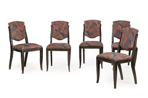 Lote 1331: Conjunto de 5 sillas art decó en madera ebonizada y tapicería de tela de época.