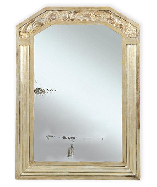 Marco de espejo art decó, con moldura en madera y pan de plata, rematado por decoración tallada con motivos vegetales.