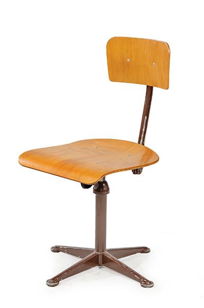 Silla de oficina giratoria con asiento alto y respaldo regulable. La estructura está hecha de chapa de acero plegada y tubo de acero, el asiento y el respaldo son de madera contrachapada. Posiblemente fabricado por De Cirkel.