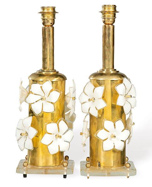 Lote 1349: Pareja de lámparas con estructura de latón con flores adheridas y base de cristal de Murano.