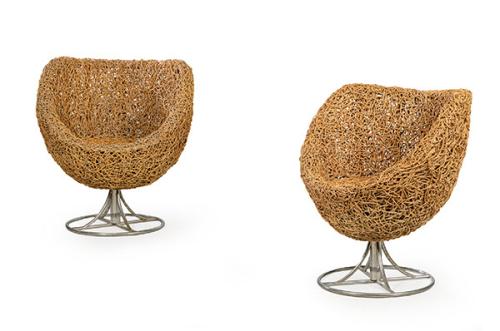 Pareja de butacas giratorias en ratán trenzado, sobre base en metal tubular cromado.