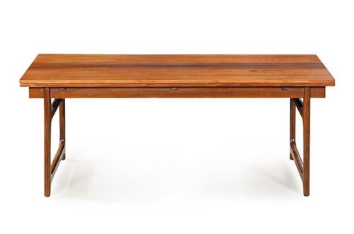 Mesa de centro rectangular, extensible a través de dos suplementos laterales, sobre patas en madera de teca, unidas por chambranas.