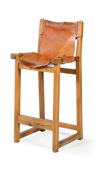 Banqueta - taburete, con estructura de madera de nogal, asiento y respaldo de una sola pieza de piel de suela natural desmontable, cosido a mano con hebillas.