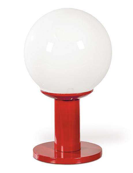 Lámpara de mesa con tulipa esférica de cristal opalino, sobre estructura cilíndrica en metal pintado en rojo.