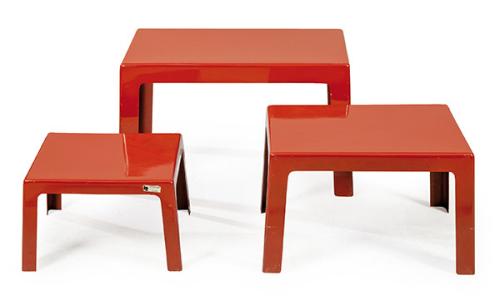 Juego de tres mesas nido en fibra de vidrio coloreada en rojo.