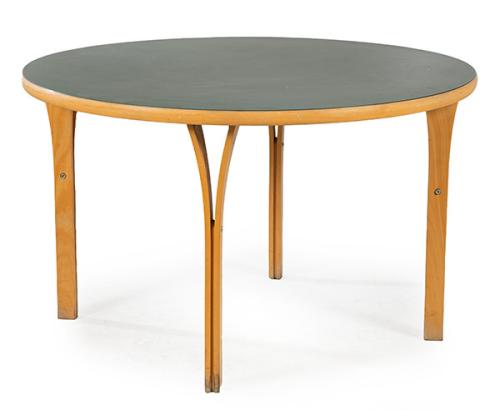 Mesa siguiendo modelos de Rud Thygesen y Johnny Sørensen para Magnus Olesen, con tapa circular en linoleo gris, y estructura en madera de abeto, con patas formadas por dos listones de madera separados en la parte superior.