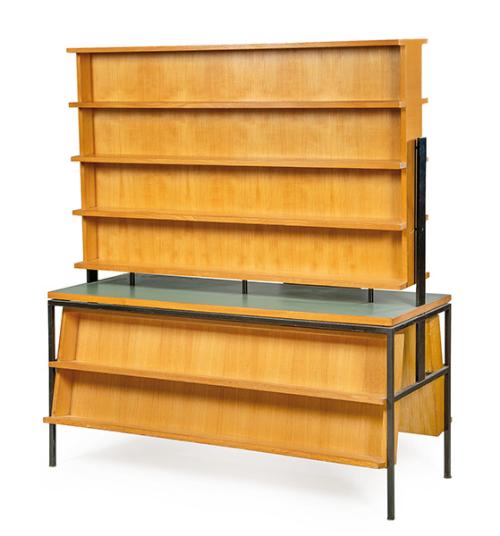 Librería exenta de doble cara, con estructura en hierro pintado de negro, madera de roble y tapa de gris.