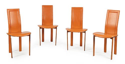 Conjunto de cuatro sillas con respaldo alto modelo Lara, con estructura de acero, completamente tapizadas en cuero color natural con costuras. Con etiqueta de la marca en los asientos.
