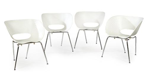 Conjunto de cuatro sillas apilables modelo Tom Vac, con patas de acero tubular cromado y estructura del asiento ondulada de polipropileno teñido color blanco.