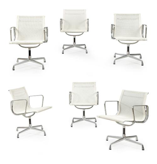 Conjunto de 6 sillas modelo EA 108 en rejilla de poliéster blanca, giratoria, con reposabrazos y estructura en aluminio fundido a presión cromado. Etiqueta con la marca, edición 2003