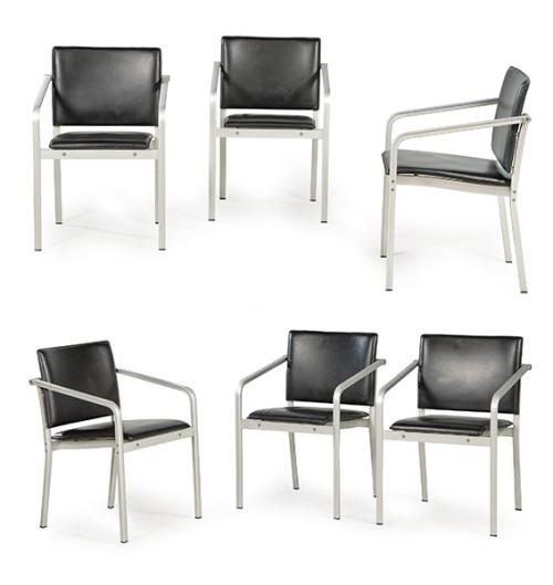 Seis sillas modelo A903PF, estructura de aluminio anodizado y piel teñida de negro. Apilable. Etiquetas de la marca.