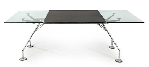 Mesa modelo Nomos, concebida como un esqueleto sólido de inspiración zoomorfa. Fue concebida para adaptarse a múltiples usos, desde el trabajo al hogar indistintamente. Realizada en acero con una estructura compuesta por un dorsal central, cuatro patas inclinadas que sobresalen y seis brazos de soportes laterales terminados con ventosas sobre las que descansa el sobre de cristal templado.