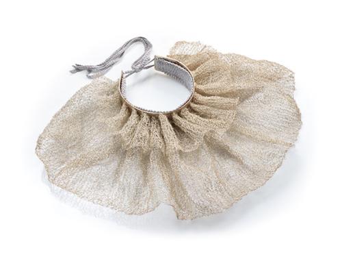 En clara referencia a las golas usadas durante el Siglo de Oro Español, nos presenta una pieza que por su ejecución nos conforma las características 'olas drapeadas' obteniendo un gran sentido escultórico.