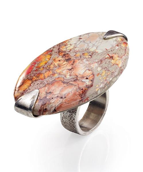 Anillo múltiple descentrado para cuatro dedos con una pieza oval de jaspe natural, representando un atardecer. Brazo descentrado para poderlo llevar comodamente. Pieza única.
