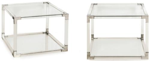 Pareja de mesas auxiliares, con estructura de sección cuadrada de plexiglás, con cantos reforzados en metal cromado y dos estantes en vidrio