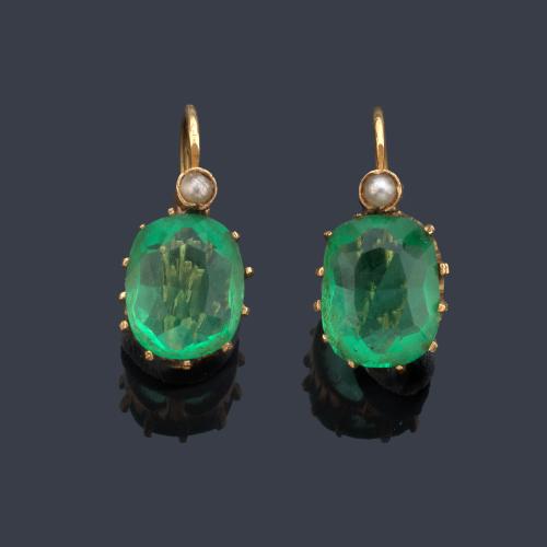 Pendientes cortos con pareja de espinelas verdes sintéticas con perlita.