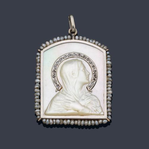 Medalla devocional 'art decó' con la Imagen de La Virgen realizado nácar con orla de diamantes talla rosa. Circa 1932.