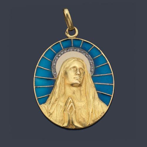 Medalla devocional con la Imagen de La Virgen con decoración en esmalte azul y corona con diamantes talla rosa. Circa 1900.