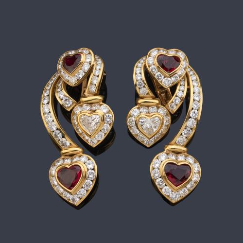 Pendientes largos con cuatro rubíes talla corazón de aprox. 7,80 ct con diamantes talla brillante y corazón de aprox. 12,08 ct en total.