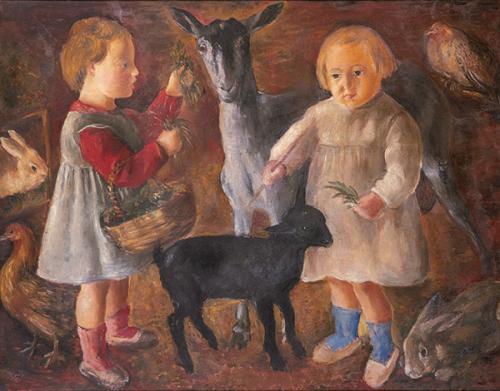 Gran pintora de la modernidad, como la llamó la hispanista estadounidense Shirley Mangini, al finalizar la Guerra Civil Rosario de Velasco se instala en Barcelona donde vivirá hasta su muerte en 1991 y la luz y la vibración cromática del Mediterráneo transformarán su trabajo. En Cataluña, la artista iniciará una evolución creativa que, con los años, la llevará a dejar a un lado la figuración y las formas más académicas de su etapa madrileña para empezar a investigar con el color y, sobre todo, con las texturas, y se verá obligada a adaptar su carrera artística a su nuevo rol de ama de casa y la crianza de María del Mar, su hija: “Pinto por temporadas, la mujer está siempre acogotada por el trabajo casero. Por eso no puedo desperdiciar mi esfuerzo en hacer retratos de otras que pretenden parecer interesantes”, diría. Los seguirá haciendo, eso sí, sin la pasión y el empeño que conferiría al resto de su obra -le daba pereza pintar las manos y los pequeños detalles, como contaría-, con excepción de los que haría de su hija: “Cuando mi madre me hacía posar para retratarme o porque quería pintar mis manos o captar alguna de mis posturas, me costaba horrores estarme quieta. Por eso siempre le pedía que me contara uno de sus cuentos, eran geniales y así me entretenía. En este cuadro tengo unos cuatro años y mi madre me retrató junto a la hija de los dueños de la fonda -que tenía un corral- donde dormíamos en Collsuspina, un pueblo del interior de la provincia de Barcelona al que íbamos en primavera a recolectar espigas a las que extraíamos el polen que luego mi padre Javier, que era alergólogo, utilizaba para las vacunas”.