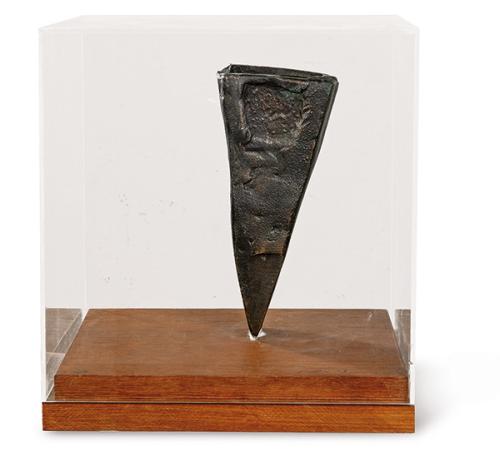 Bronce patinado incrustado en madera con caja de metacrilato
