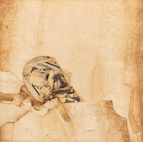 Acuarela, tinta y collage de periodico sobre tabla