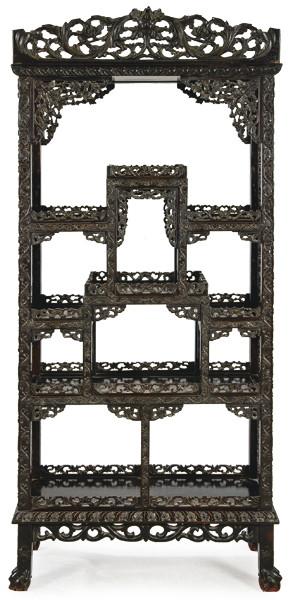 Estantería china de madera de hongmu tallada, Dinastía Qing ff. S. XIX pp. S. XX.. Con cuatro niveles de baldas y profusamente tallada con motivos vegetales. Conserva etiqueta de casa de subastas londinense de principios del S. XX. Medidas: 176 x 33 x 80 cm